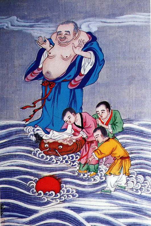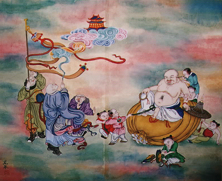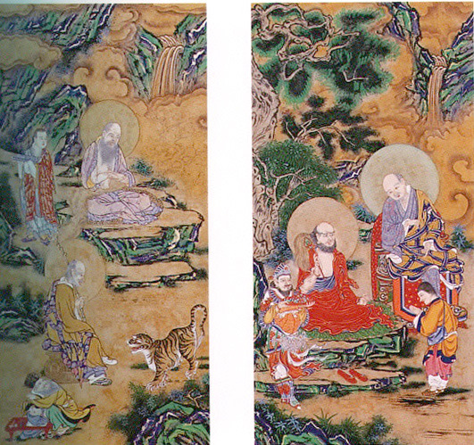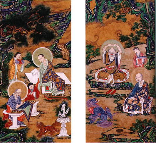The Korean Buddhist art tradition has its roots of course in the Ajanta caves in India. That tradition traveled along the Silk Road and proliferated in the sacred Caves of the Thousand Buddhas in China, eventually reaching Korea. Chinese culture heavily influenced Korean culture for many centuries throughout history, and Buddhist art was no exception. Even today, Chinese line drawings are greatly prized and admired, but Koreans do what comes naturally to people everywhere add local flavor to the imported culture. And during the Choson Dynasty, when Buddhism was largely banished to the countryside, a fascinating mixture of folk art and Buddhist art took place, leaving an indelible Korean flavor to the imported traditions.