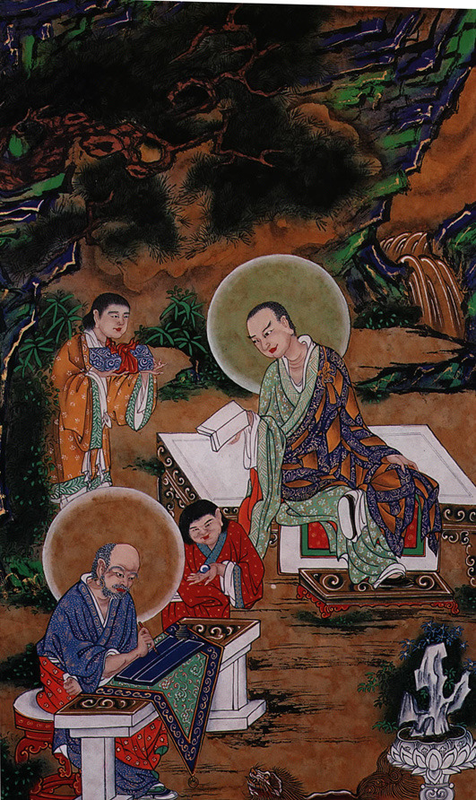Although little known to the outside world, the rich tradition of Korean Buddhist art is alive, well and even enjoying a revival as more and more young people look the tradition as both a skill and a means of Buddhist practice. In fact, the traditional course of becoming a "Gold Fish" (i.e. a recognized professional Buddhist artist) was, in the old days, as much of a means of becoming enlightened as it was of preserving and promoting the great art tradition. The traditional course was a rigorous 20-year one that involved tracing, drawing and free-hand sketching a total of 3,000 copies of each of three line drawings -- a King of Bardo, a Guardian and a Bodhisattva -- and combining this with Sutra study at night. The rush and instant demands of modernity have done much to upset that tradition; yet some of modernity's conveniences, such as the Xerox machine that can size line drawings to perfection, have guaranteed the swifter proliferation of more Buddhist paintings. And while in earlier centuries Buddhist painting was almost exclusively limited to monks, today the art has been taken up by large numbers of lay people, including a formidable number of women, something that would have been unthinkable in a staunchly Confucian Korea even a decade ago.