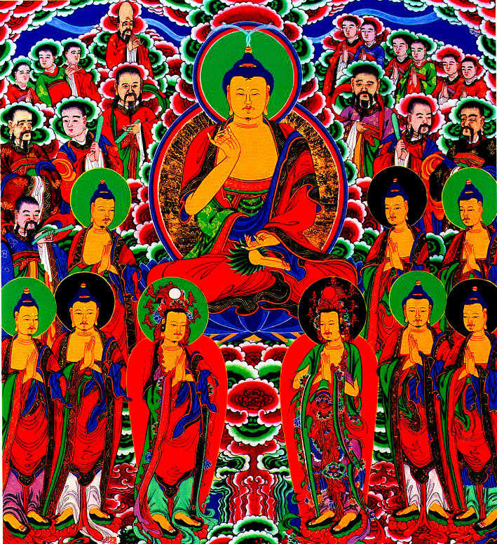 The equality of everything as espoused by Buddhism is taught through the mastery of the most common temple painting line, the "vertical line" which is equally thin (or thick) from top to bottom throughout the entire painting. This line is hard to master at first, but practice, and lots of it, makes perfect. One of the main purposes of doing thousands of copies of the King of Bardo is to develop this skill. Abdominal breathing and holding the breath while drawing the line help to maintain clarity of mind and draw a steady line. These equal lines can be found even on the early Tunhuang cave murals in China and they were among a variety of line types perfected by the 8th century Tang court superartist Wu Taotze, who's highly stylized drawings set the pace for all future Chinese, and eventually Korean, Buddhist paintings.