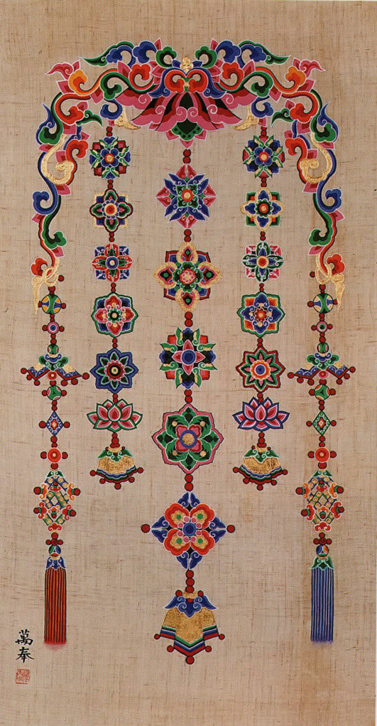 On August 1, 1972, along with two other monks -- the late Ven. Ilsop and the late Ven. Wolju -- he was given the title (commonly called "Living National Treasure") of "Preserver of Intangible Cultural Property No. 48, Tanch'ong.". Tanch'ong, literally "red-blue," is the term for colorful cosmic patterns and designs on temples and other important buildings. In a broader sense, it is the traditional term which encompassed all Buddhist temple painting.
