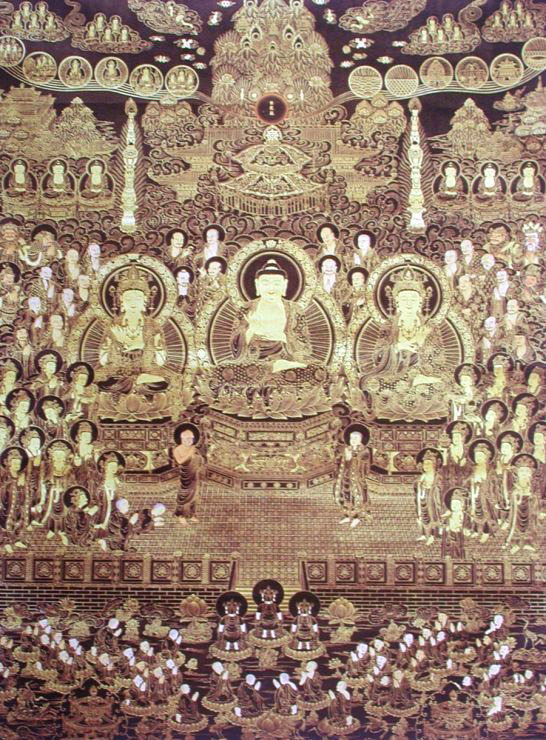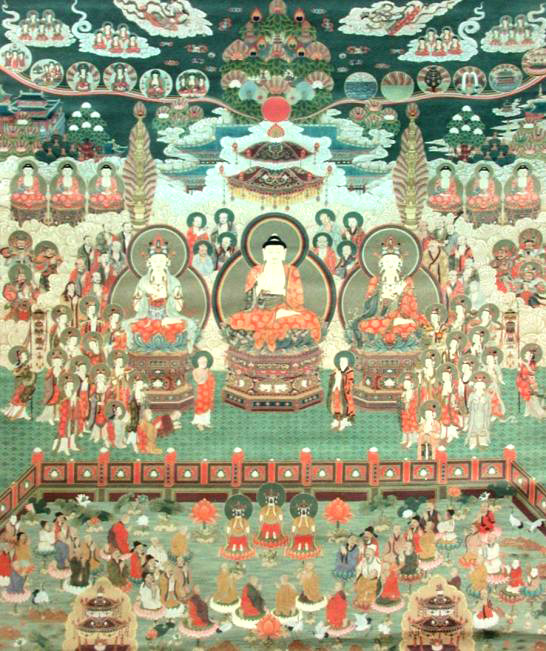 - Amitabha with a large retinue (disciples, musicians, etc.).