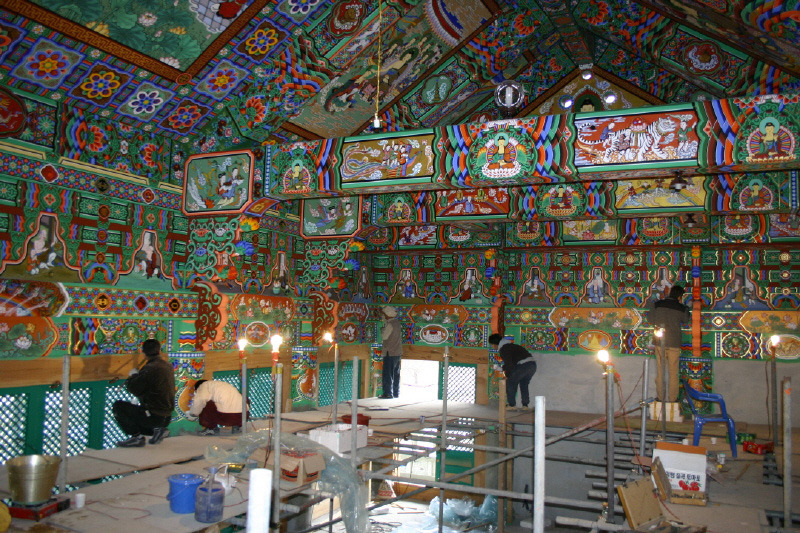 The outside eaves, the inside rafters and the ceilings are covered with intricate Dancheong patterns. On the main temple beams and among the rafters, interwoven between the patterns, you will find pictures of spirits, ancient monks, Bodhisattvas and dragons, to name a few. It is said that during the Shilla period, Dancheong was even found on commoners' home. Now it is limited to temples and palaces as well as some musical instruments.