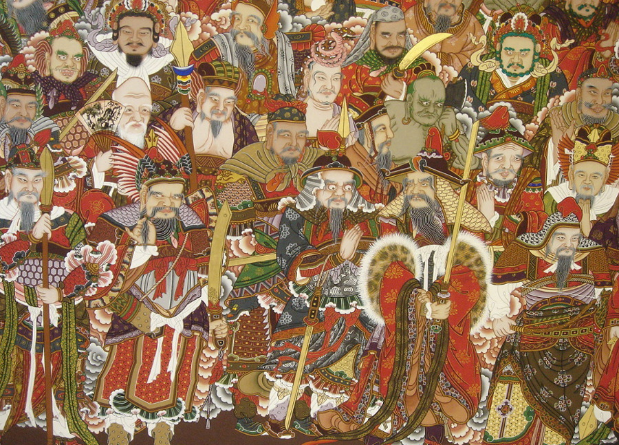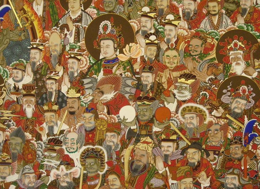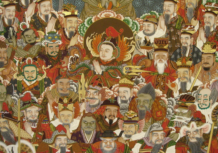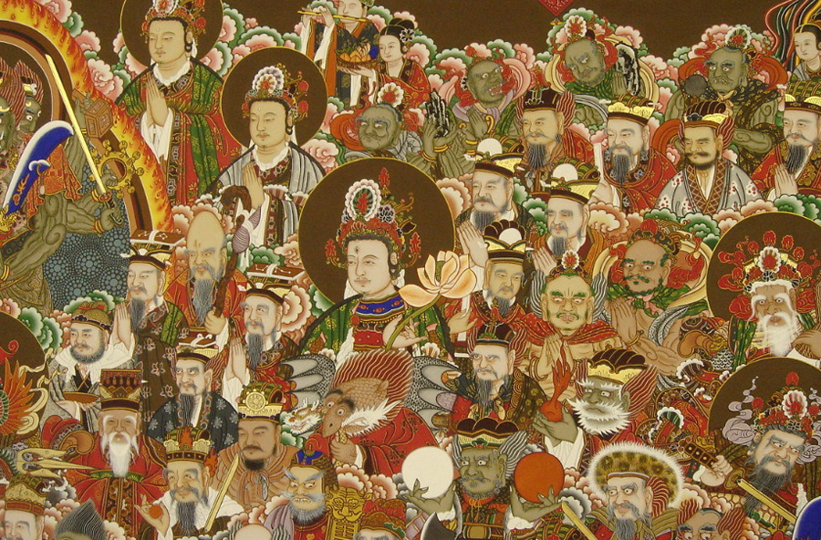 There are different interpretations of the Shinjung Taengwha. One is that the figures sur-rounding Tongjin represent beings who are well-acquainted with the Three Refuges: the Buddha, his teaching (Dharma), and the Buddhist community (Sangha). Another is that the figures are historical personages such as Confucius, or lesser deities like the Kitchen God. The four, or sometimes five, figures at the base of the paint-ing or to the sides of Tongjin Posal, are clearly guardians. One guardian often carries a rolled-up scroll, representing the doctrine which he protects.